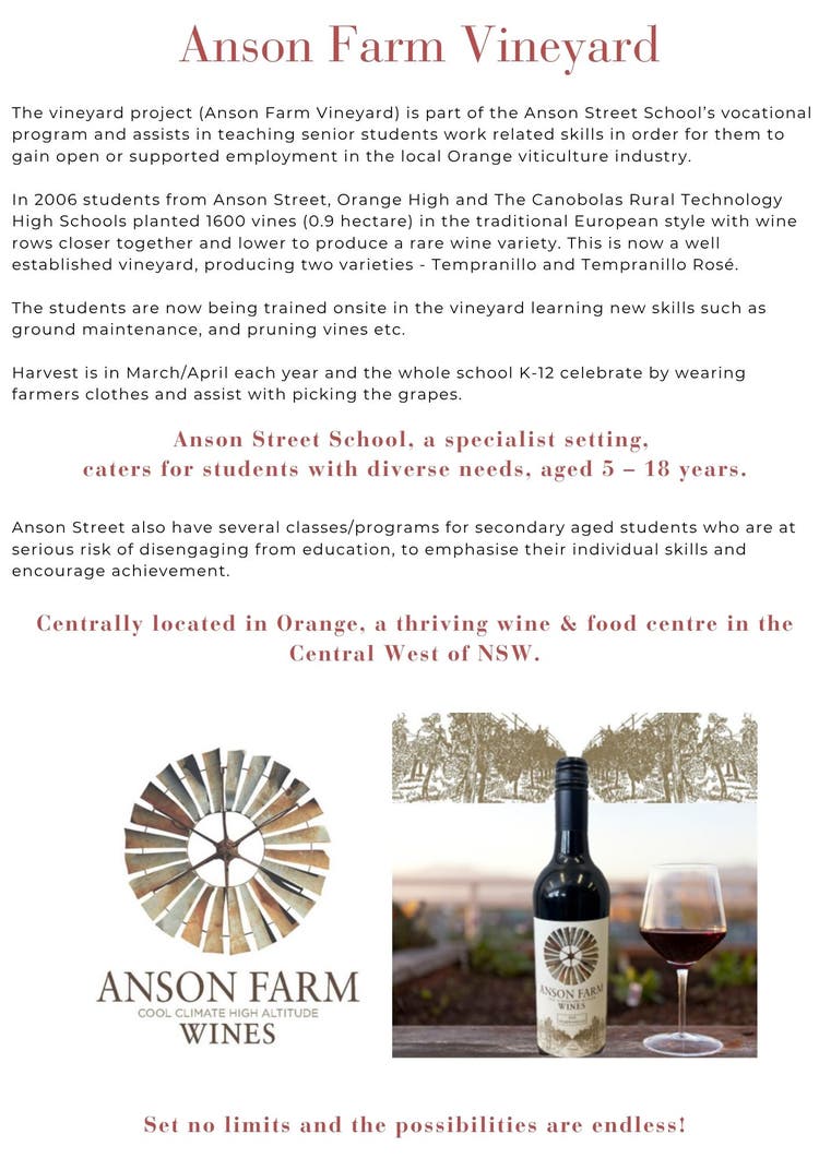 The vineyard project (Anson Farm Vineyard) is part of Anson Street School’s vocational program and assists in teaching senior students work related skills in order for them to gain open or supported employment in the local Orange viticulture industry.
